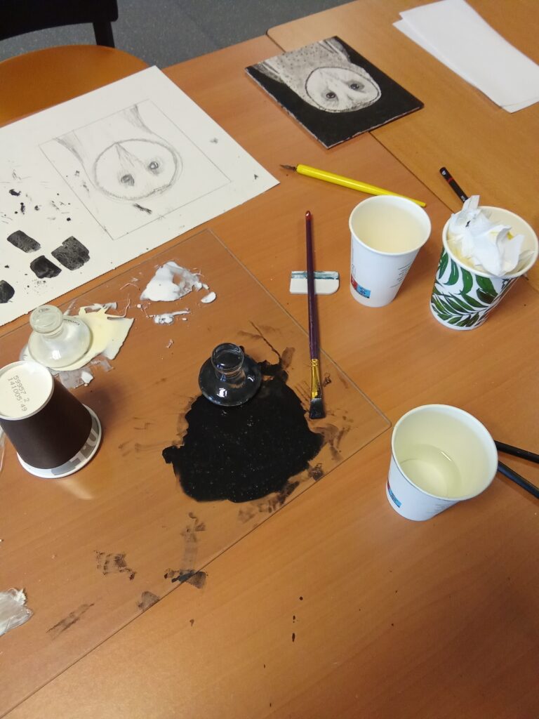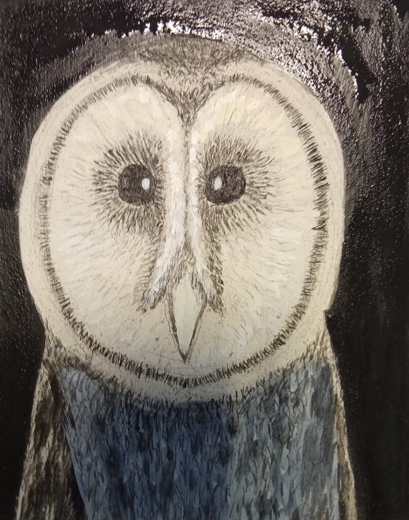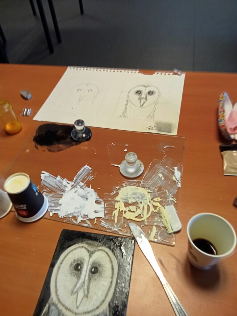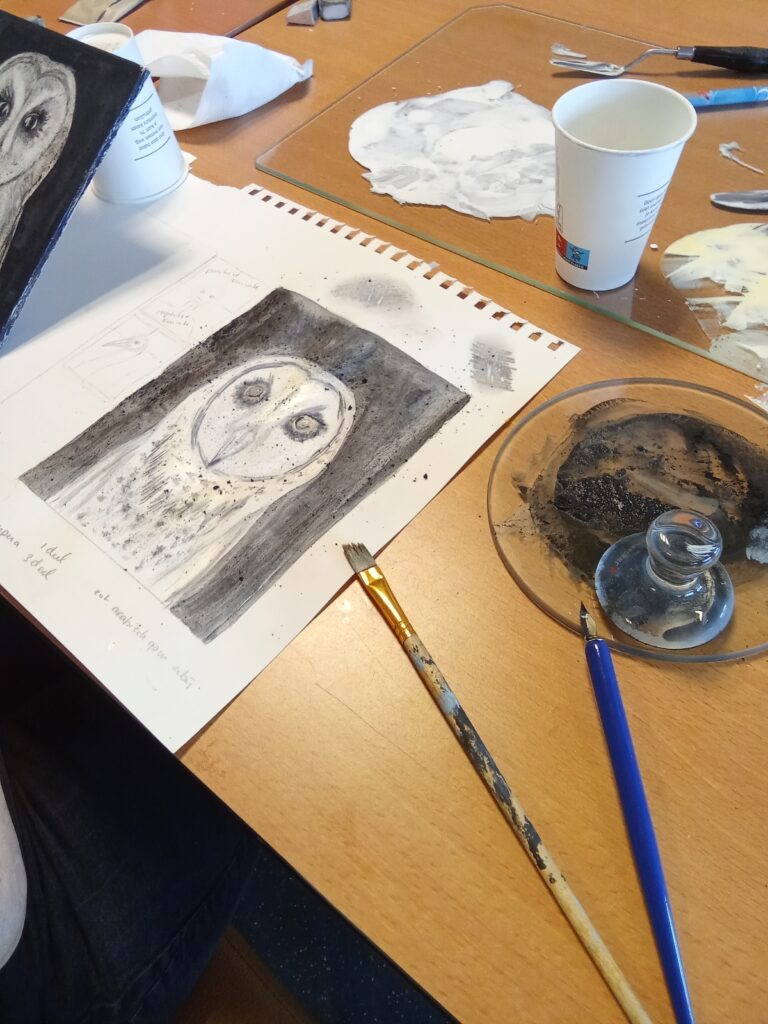 Our last workshop on the classical arts. We looked at the real gesso technique, grinding dry pigments, with gum arabic and egg tempera. We used a classic portrait composition and a very brief look at gold leaf. In the future I will expand this workshop a week further to explore the gold leaf a little deeper. The black background emphasizes the subtle details in the lighter parts of the owl. Some well mastered owl portraits where produced that where realistic, well detailed and had a sense of atmosphere about them. Quite an achievement.