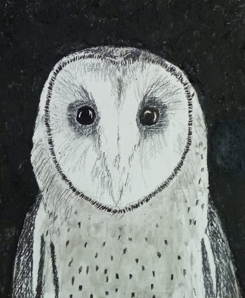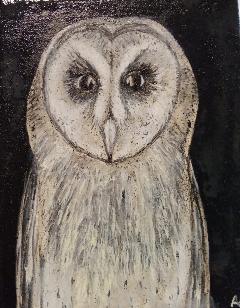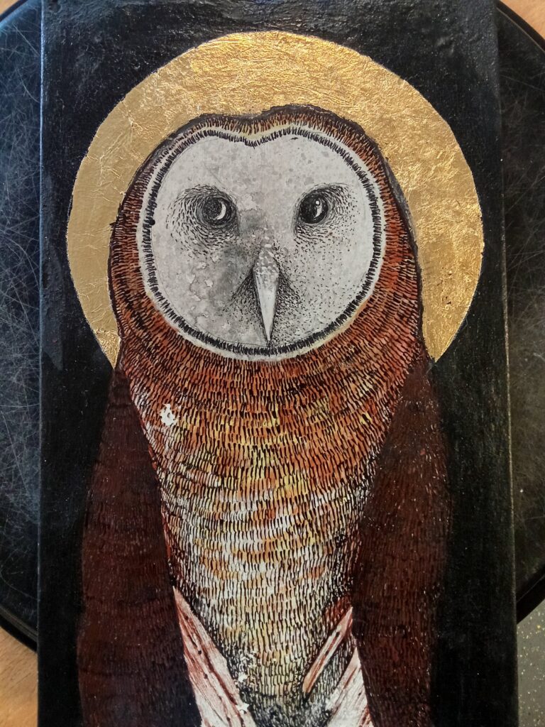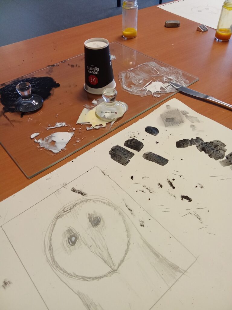 Our last workshop on the classical arts. We looked at the real gesso technique, grinding dry pigments, with gum arabic and egg tempera. We used a classic portrait composition and a very brief look at gold leaf. In the future I will expand this workshop a week further to explore the gold leaf a little deeper. The black background emphasizes the subtle details in the lighter parts of the owl. Some well mastered owl portraits where produced that where realistic, well detailed and had a sense of atmosphere about them. Quite an achievement.