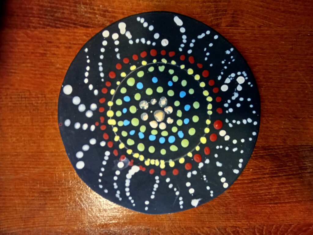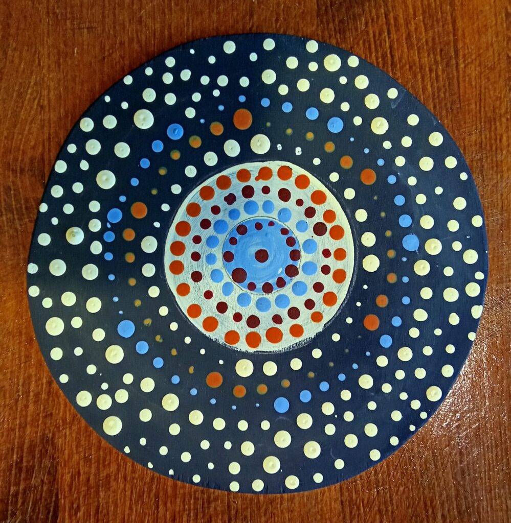 Dot painting is a modern version of an ancient technique used by the Aboriginal people of Australia. We look at history, symbolism and meaning. We explore colour theory, mixing and story telling. Participants produce their on original artwork all materials supplied. Suitable for up to 10 people. The duration is flexible but a single time of 2 hours is possible. All materials supplied. The cost of this workshop is 272.50 euro (Includes tax)